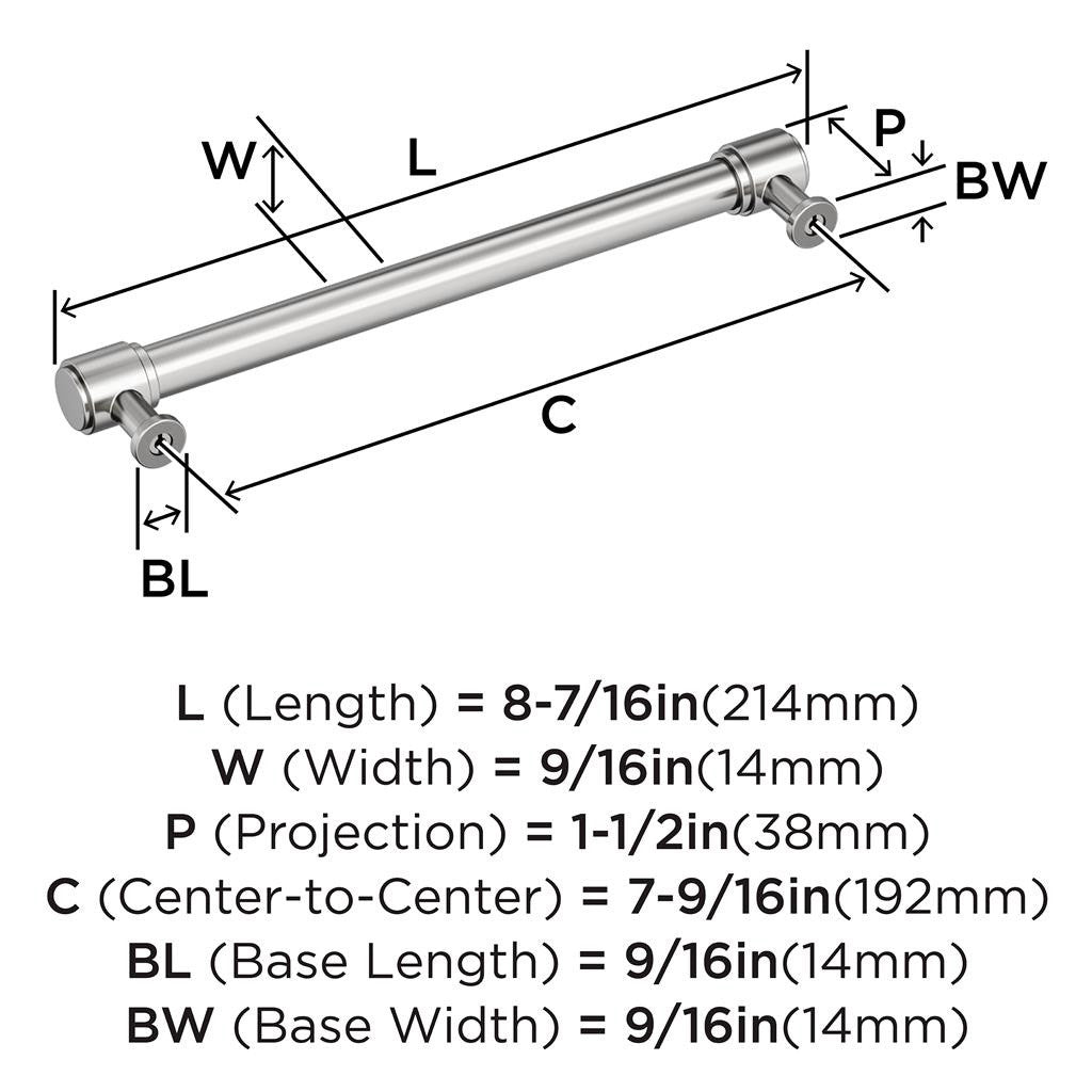 - Center to Center: 7-9/16 inch (192mm), Length: 8-7/16 inch, Width: 9/16 inch, Projection: 1-1/2 inch
