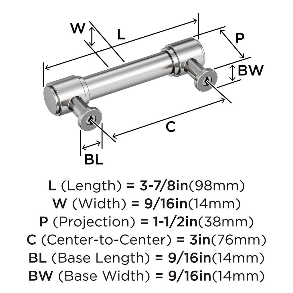 - Center to Center: 3 inch (76mm), Length: 3-7/8 inch, Width: 9/16 inch, Projection: 1-1/2 inch