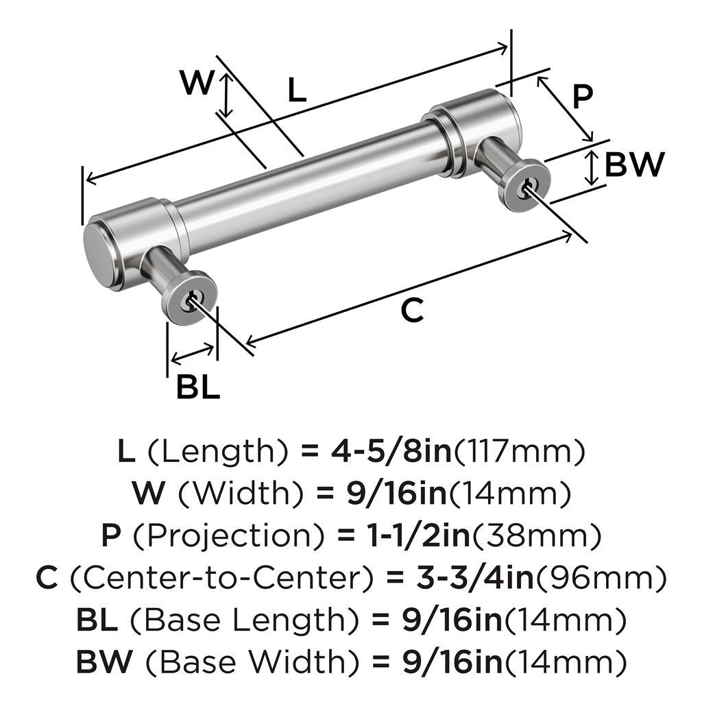 - Center to Center: 3-3/4 inch (96mm), Length: 4-5/8 inch, Width: 9/16 inch, Projection: 1-1/2 inch