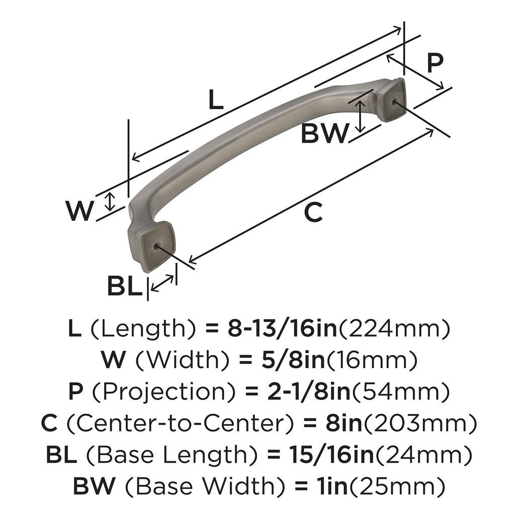 - Center to Center: 8 inch (203mm), Length: 8-13/16 inch, Width: 5/8 inch, Projection: 2-1/8 inch, Base Length: 1 inch, Base Width: 15/16 inch