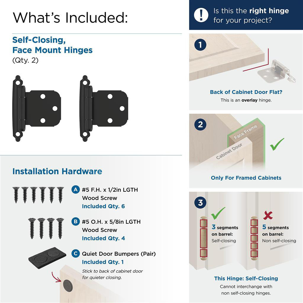 AMEROCK Self Closing Face Mount Extended Tab Variable Overlay Cabinet Hinge (pair) in Flat Black is backordered and will ship as soon as it is back in stock.